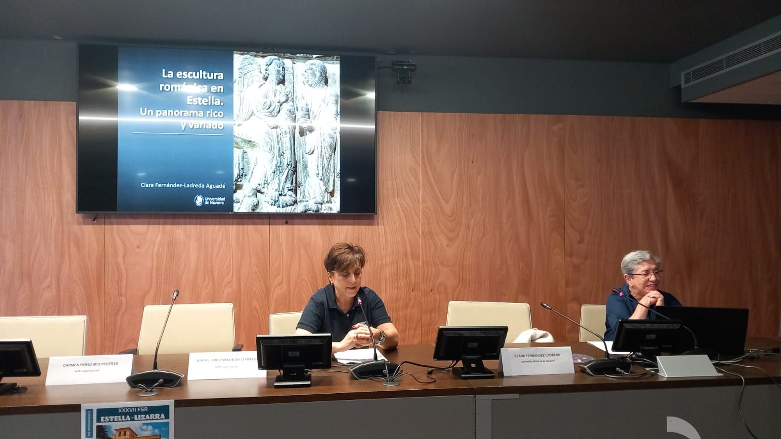 Por último, Clara Fernández Ladreda, doctora en Historia por la Universidad de Navarra, fue la encargada de cerrar las actividades de la mañana con la conferencia titulada “La escultura románica en Estella: un panorama rico y variado”. En su intervención abordó de forma minuciosa la configuración de toda la decoración escultórica de los edificios más relevantes de Estella. De la portada norte de la iglesia de San Miguel, promovida por los burgueses del barrio homónimo y ejecutada en torno al año 1187, destacó el tímpano con Cristo en Majestad en cuya mandorla hay una inscripción dirigida contra la herejía cátara. La inscripción reza así “Nec Deus est nec homo presens quam cernis imago, sed Deus est et homo quam sacra figurat imago” y viene a querer decir algo así como que lo que se venera no es la imagen en sí, sino lo que la imagen representa, la figura que hay detrás de ella, de manera que no se practicaba la idolatría denunciada por diferentes colectivos de la época. Respecto de la iglesia de San Pedro de la Rúa hizo especial hincapié en la explicación de los capiteles del claustro en los que se representa la parte del ciclo de la Vida Pública de Cristo y, entre otros, el Martirio de San Andrés por parte del procónsul Egeas. Por último, del Palacio de los Reyes de Navarra habló de la decoración de los capiteles en donde puso de relieve el capitel del combate entre Roldán y Ferragut el cual lleva la firma de su autor, un tal Martín de Logroño.