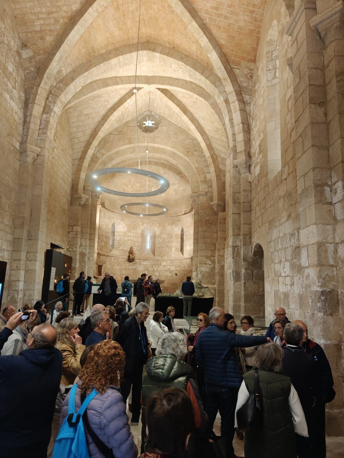 Una vez dentro del edificio sagrado Clara Fernández y Ana Ulargui deleitaron a los asistentes con sus interesantes explicaciones cargadas de sabiduría. Se comenzó la visita con la configuración arquitectónica del edificio, para pasar luego a la decoración escultórica en donde se habló de algunos capiteles de interesante decoración vegetal, entre los que destacaba el derecho del arcosolio ubicado en el presbiterio de la capilla del lado de la Epístola, que fue reutilizado de los que había en el claustro. Se cerró la visita al interior de la iglesia con la imagen del Cristo Crucificado. Continuó la visita por el interesante claustro románico en el que la profesora Fernández asumió las riendas del tour y explicó minuciosamente todas las imágenes talladas en los capiteles con la Vida Pública de Cristo y el martirio de diferentes santos como por ejemplo San Andrés.