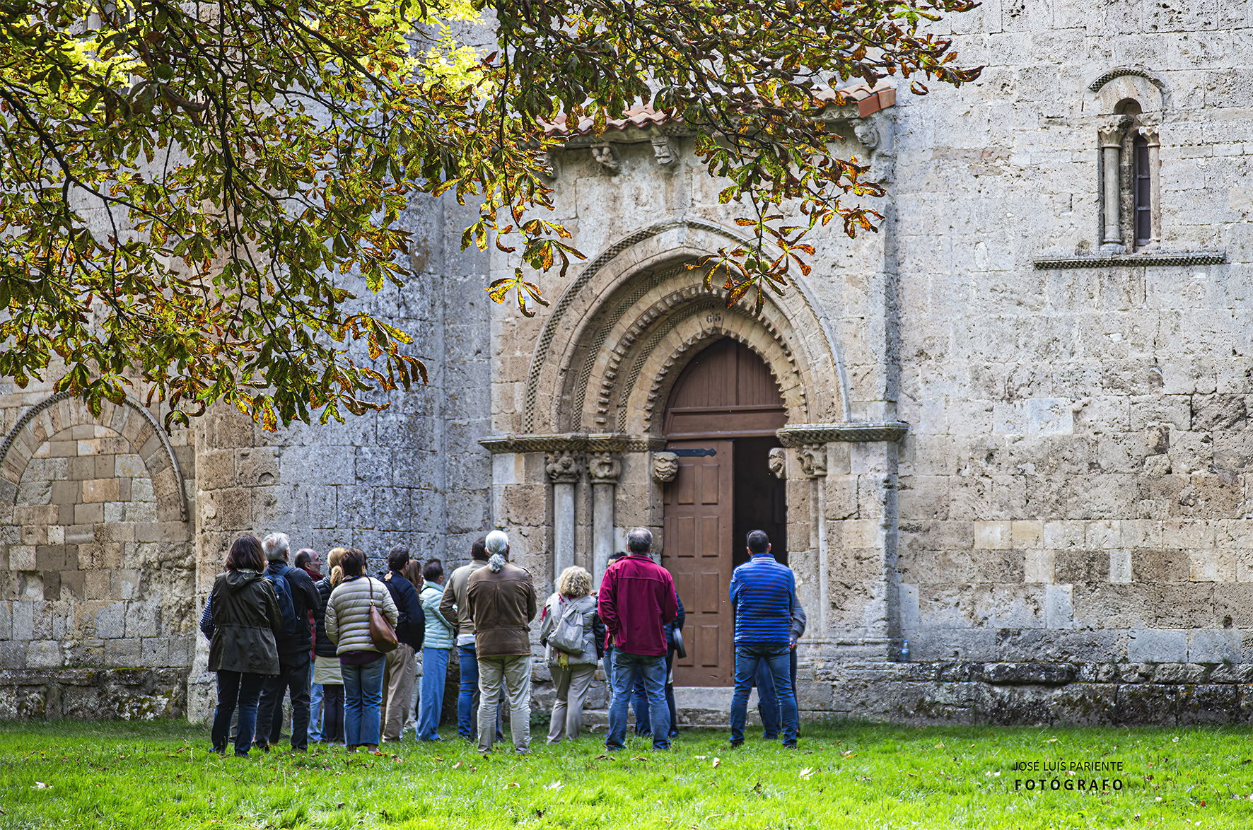 Una guía distinta, Irene, acompañada por el Alberto, el custodio del edificio, explicó que el lugar forma parte del corredor de la Bureba, paso ancestral de pueblos y viajeros. Hizo mucho hincapié en que sus explicaciones, más allá de los tecnicismos y las características del estilo, se centrarían en comprender la relación entre paisaje, cultura y memoria.