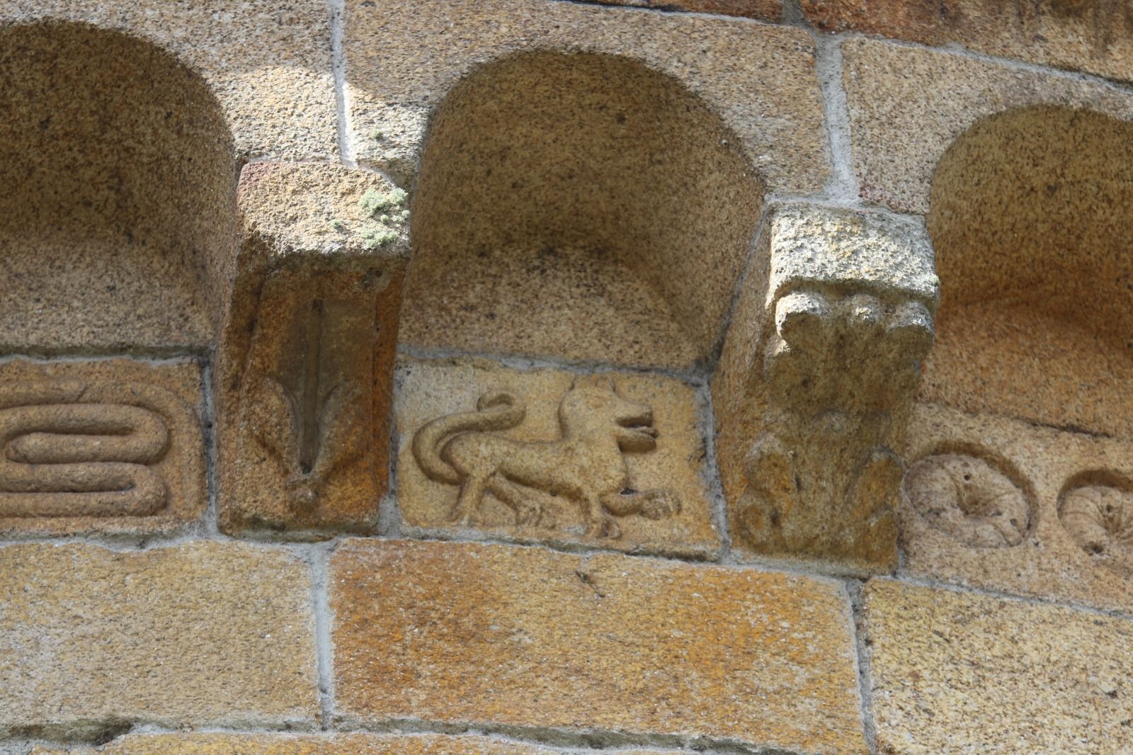 En el exterior prácticamente los detalles de interés se concentran en el ábside, ricamente decorado con arquillos ciegos entre los que se colocan unas metopas labradas con diversos motivos, entre ellos el águila que está relacionada con una leyenda según la cual en un determinado momento del conflicto que hemos mencionado apareció un águila volando en dirección contraria, lo que se consideró un agüero desfavorable. Todo el ábside es realmente interesante y probablemente lo más valioso de la iglesia. Además, el paisaje desde aquí es muy agradable de ver y todos lo disfrutamos mucho.