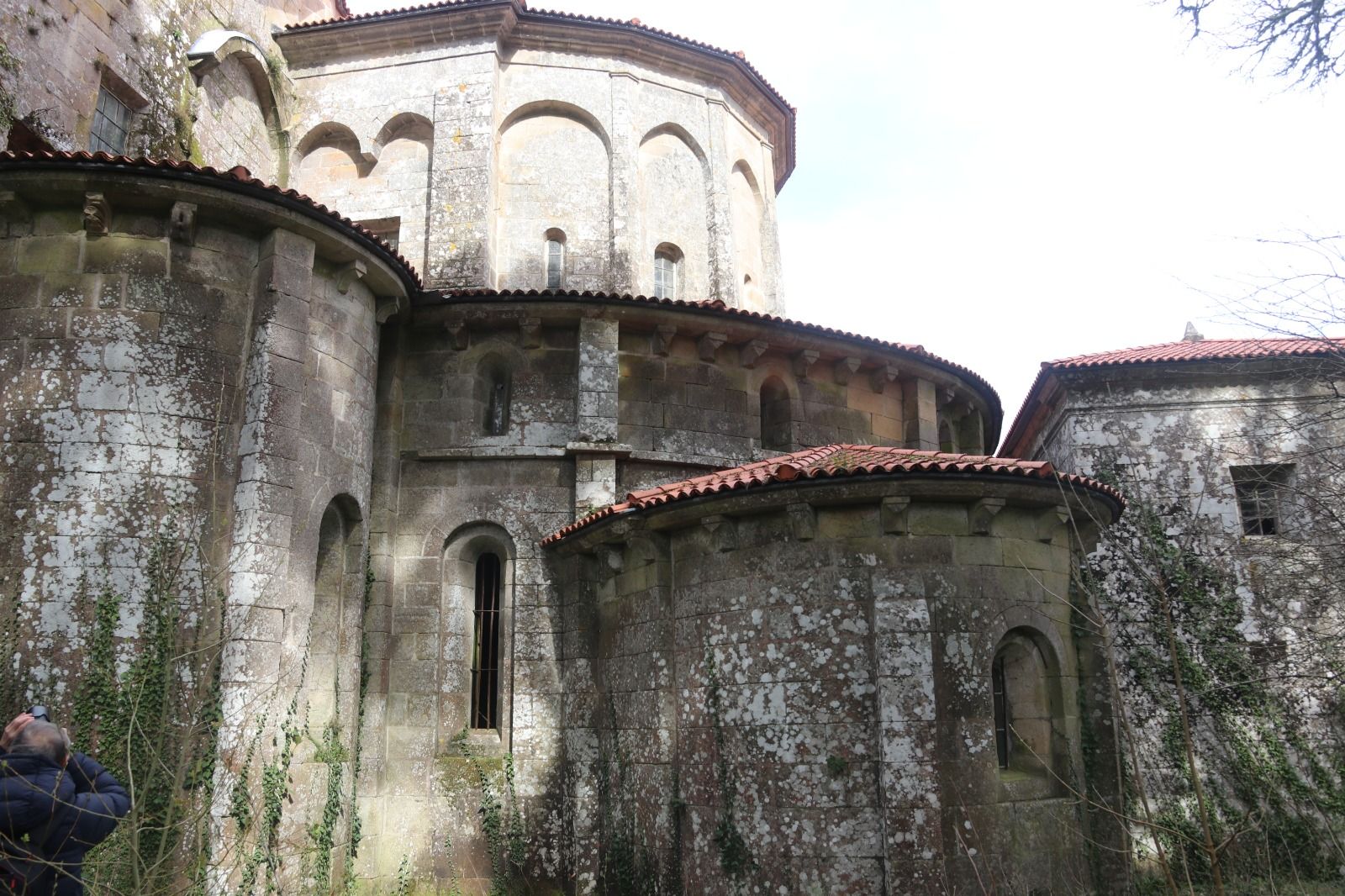 No fue posible visitar el claustro puesto que estaba cerrado por motivos de seguridad. En cambio, pudimos ver la parte exterior del ábside desde el extremo del brazo sur del crucero donde hay un recinto que se utiliza como sacristía y que tiene una magnífica escalera de piedra que sube a un nivel superior que llevaba al claustro superior. Desde este recinto se puede acceder a la parte exterior del ábside, pero estaba cerrada por una puerta y una reja exterior, ambas con candado. Aunque la señora que nos ha abierto no tenía las llaves de los candados, conseguimos abrirlos (no vamos a contar cómo) y llegar a una especie de patio desde que el que es posible ver la parte exterior del ábside que tiene una articulación de volúmenes realmente interesante.